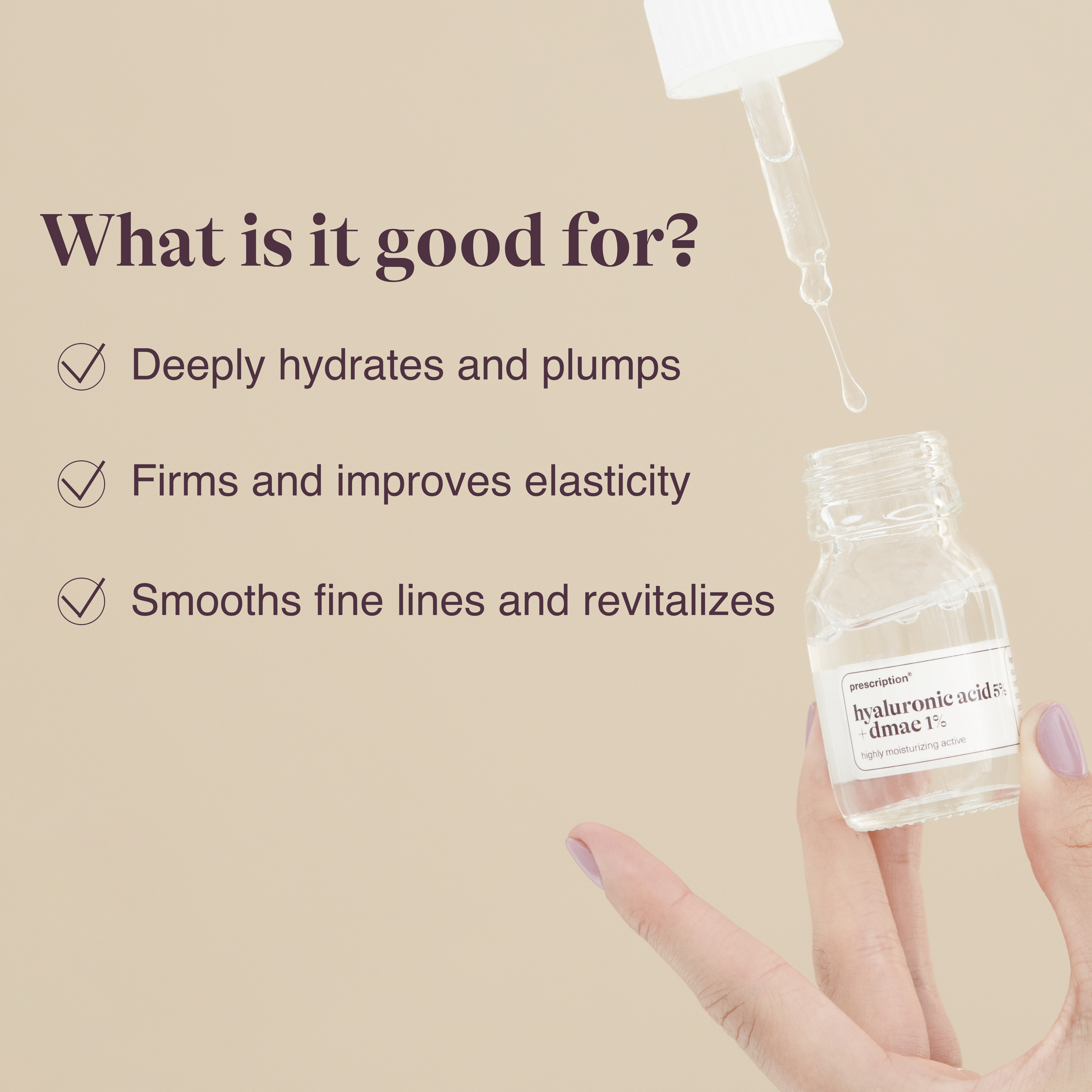 “De combinatie van hyaluronzuur en DMAE biedt directe én langdurige voordelen: intensieve hydratatie en een zichtbaar verstevigend effect. Een must-have voor iedereen die de huid voller, gladder en stralender wil maken.”