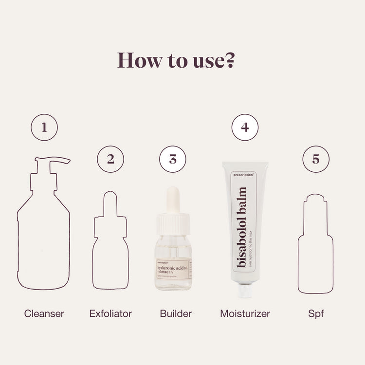 Vor dem Schlafengehen: Reinigen Sie Ihre Haut wie immer. Tipp! Mische Glykolsäure 10% in Dein pflanzliches (Edelweiss) Reinigungsmittel. Tragen Sie 5 Tropfen Hyaluronsäure 5% + DMAE 1% auf Gesicht und Hals auf. Nehmen Sie eine großzügige Menge des Bisabolol-Balsams, reiben Sie ihn warm zwischen den Händen und tragen Sie ihn auf. Du kannst eine gute Schicht auftragen, denn du verwendest den Balsam jetzt als Nachtmaske. Schlaf gut!