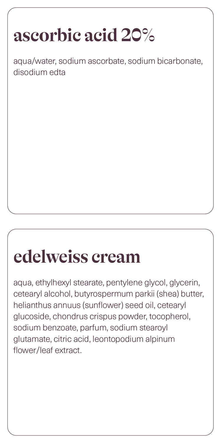 Do you have persistent pigment spots that just won't go away? And do you want a beautiful even skin texture? Then this is the combination you need. Ascorbic acid, or Vitamin C, stimulates the production of collagen which renews your skin and makes it super even. Hello glowy skin!