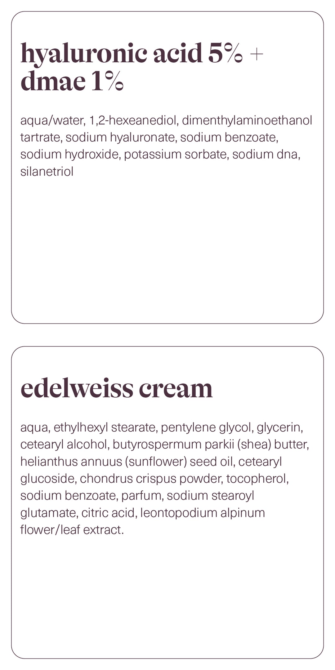 Apply the edelweiss cream every morning and evening + (3 drops) hyaluronic acid. The result? A radiant and soft skin.